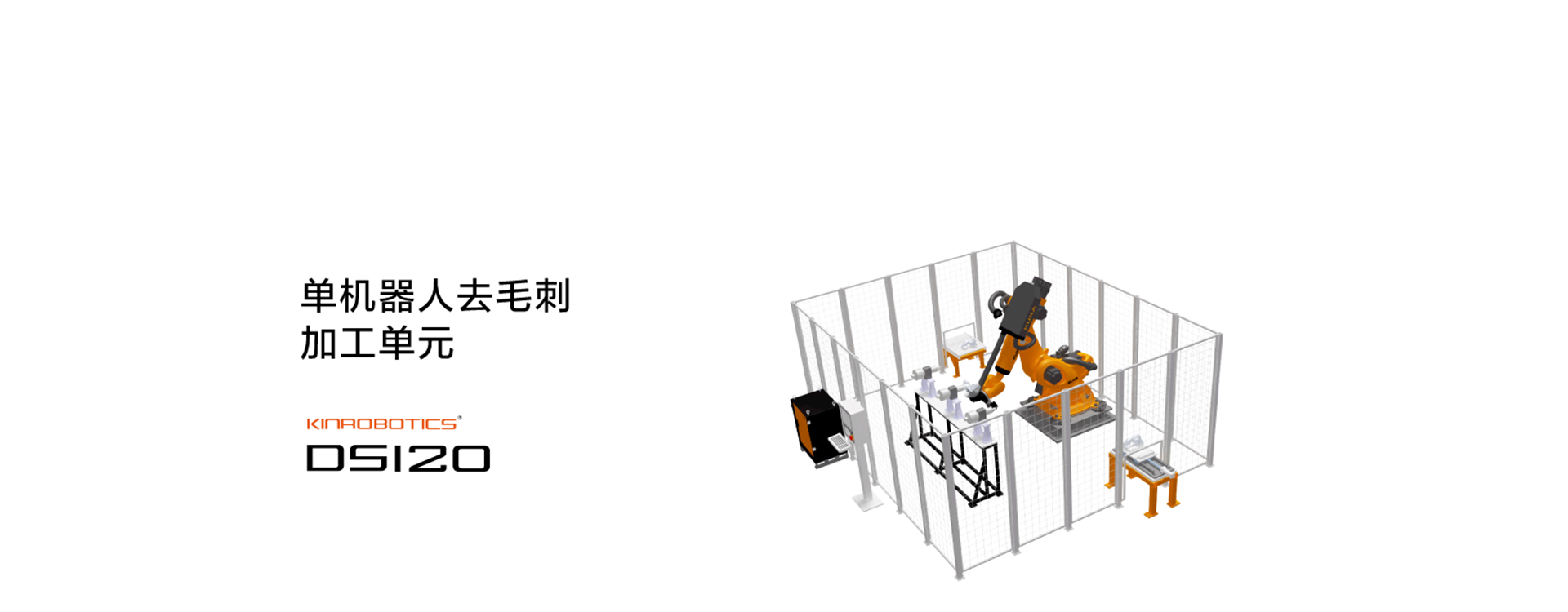 单机器人去加工毛刺单元是针对中小型的铸件,利用机器人带夹持工具对铸件的毛刺飞边的打磨而专门设计的产品。该单元主要由机器人、打磨动力头构成 ,工件上料平台与工件下料输送辊道的协同,全自动化完成工件产品的去毛刺和打磨过程,工件最大重量50kg。